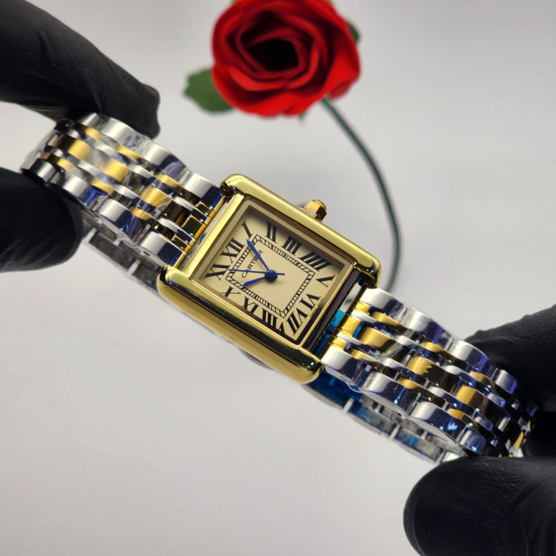 Ce modèle se distingue par son look distinctif, caractérisé par une forme carrée et un bracelet en acier aux nuances dorées et argentées qui offre une allure élégante et audacieuse. Ce mélange de couleurs apporte une touche de sophistication, parfait pour toutes les occasions, qu'elles soient formelles ou décontractées.