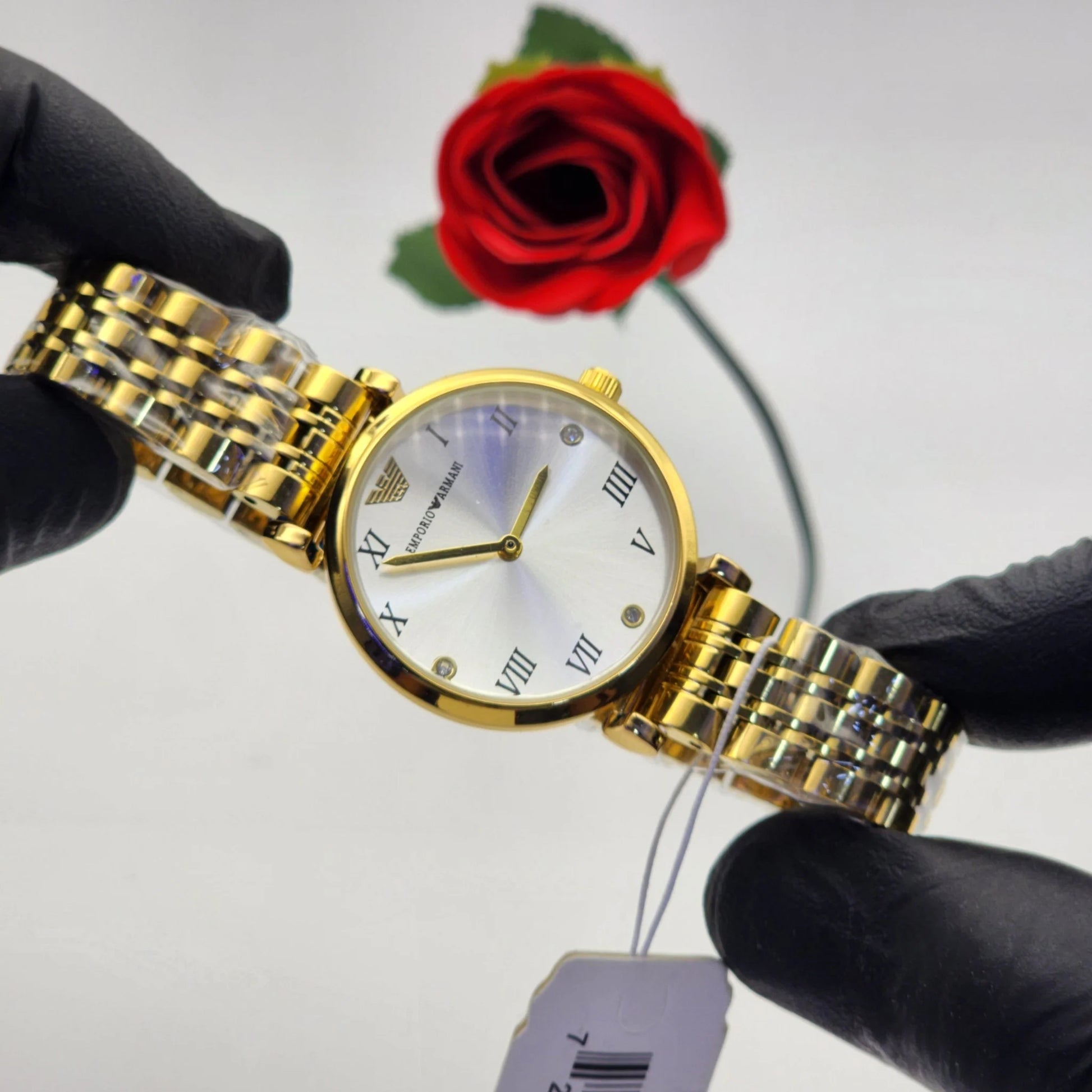 Le boîtier en doré et le cadran lumineux avec des chiffres romains créent un contraste élégant. Le bracelet en maillons offre à la fois style et confort, s'ajustant parfaitement au poignet.