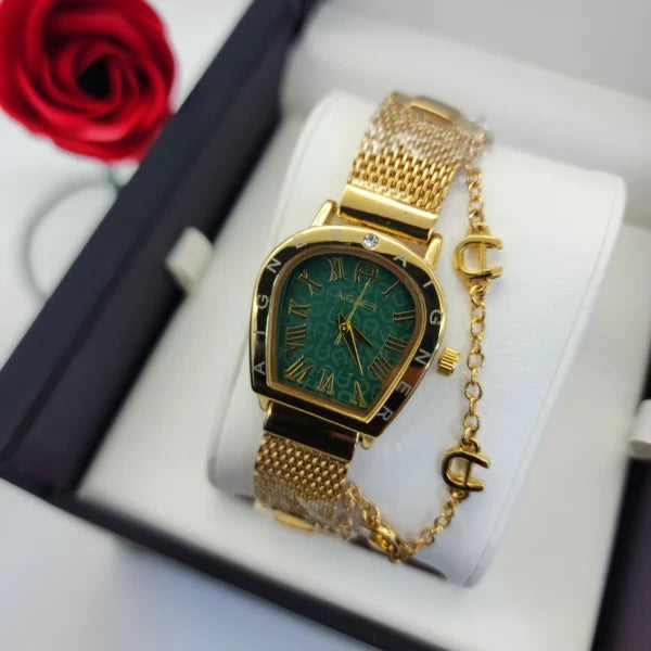 Plongez dans le raffinement avec cette montre-bracelet Aigner exclusive. Son design sophistiqué, en finition dorée, ajoute une touche de glamour à votre poignet. Le cadran vert, orné de chiffres romains, se distingue par une élégance intemporelle. Le couvercle délicat, qui dissimule le cadran, crée un effet surprenant, alliant discrétion et sophistication.