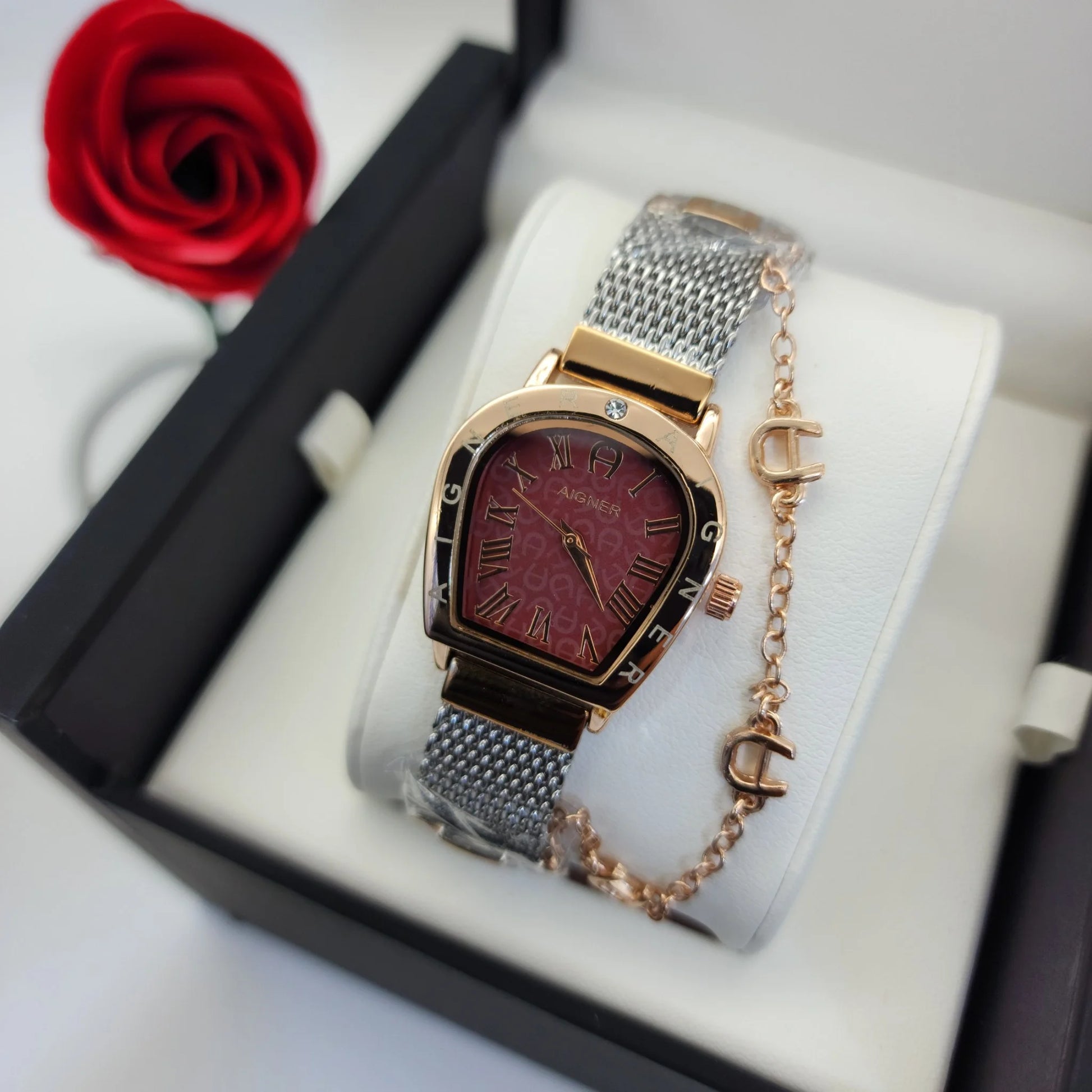 Découvrez le summum de l'élégance avec cette montre-bracelet Aigner, une pièce maîtresse de sophistication. Son design raffiné, en finition rose doré, apporte une touche de glamour à votre poignet. Le cadran rouge, orné de chiffres romains et d'un motif subtil, crée un contraste saisissant, offrant une lisibilité parfaite tout en ajoutant une note audacieuse à votre look.