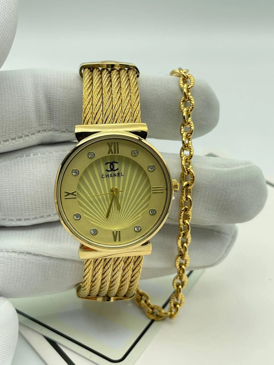 Bracelet en tresse dorée : Le bracelet en tresse dorée assure un ajustement confortable et une allure raffinée. Sa finition brillante complète harmonieusement l’ensemble, faisant de cette montre un choix idéal pour toutes les occasions.