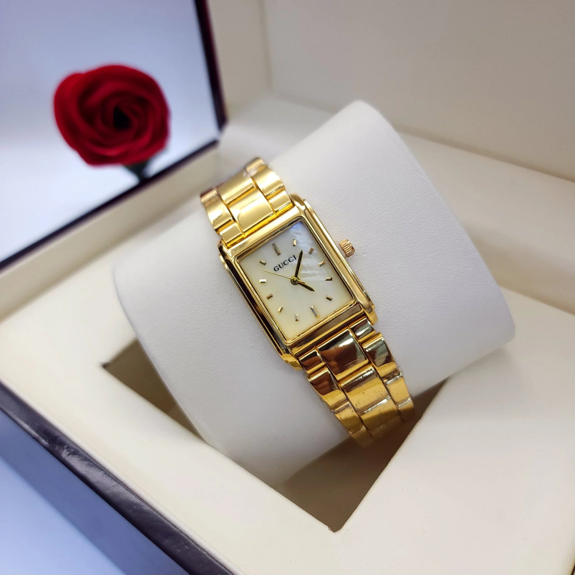 Le boîtier doré en acier inoxydable capture l’essence de l’élégance, tandis que le cadran crème avec ses index délicats offre une allure classique et sophistiquée. Chaque détail est soigneusement conçu pour refléter l’art de vivre à la Gucci.