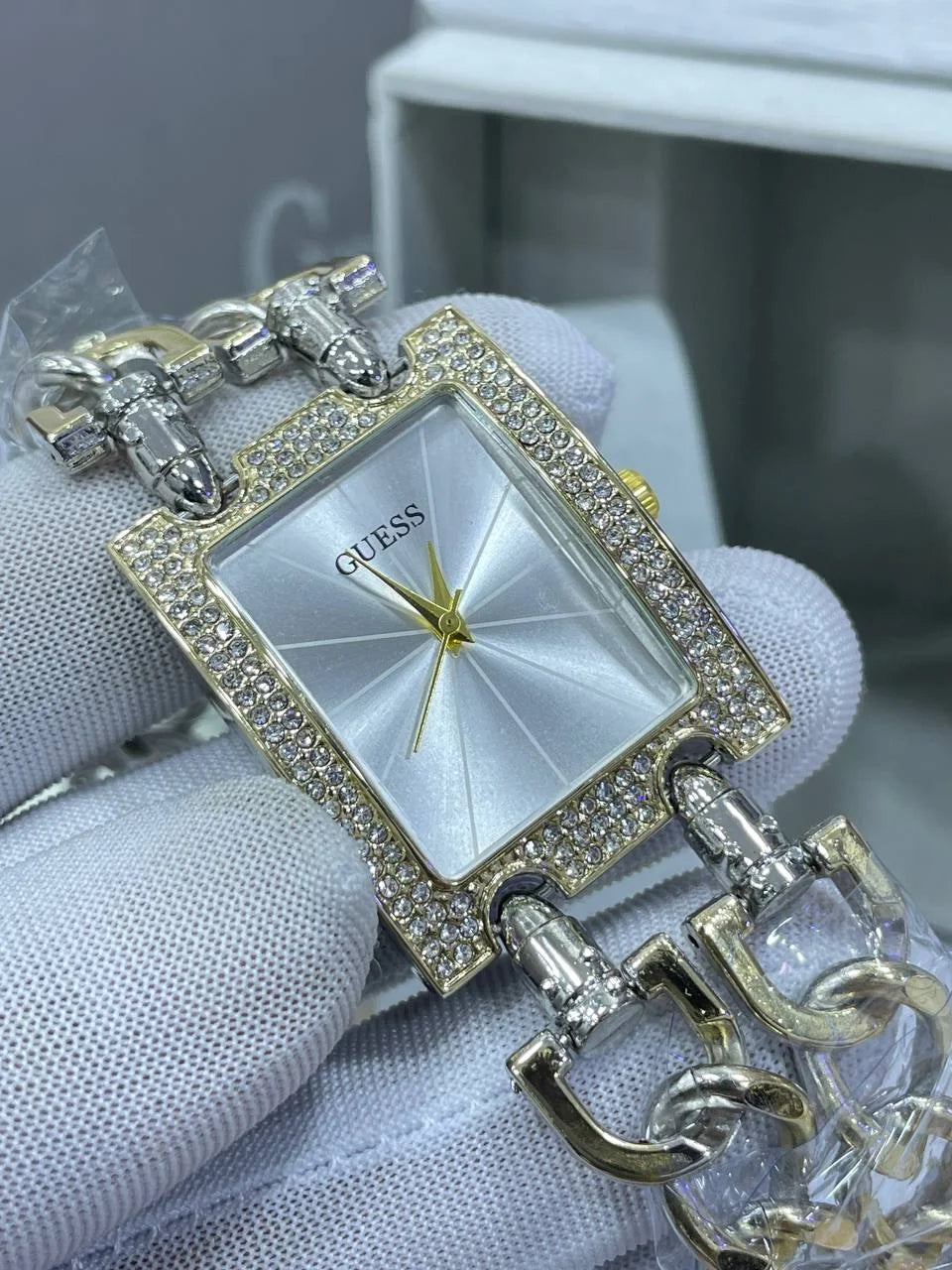 Cette montre Guess présente un boîtier rectangulaire en acier inoxydable, orné de cristaux étincelants qui ajoutent une touche de luxe à votre look.