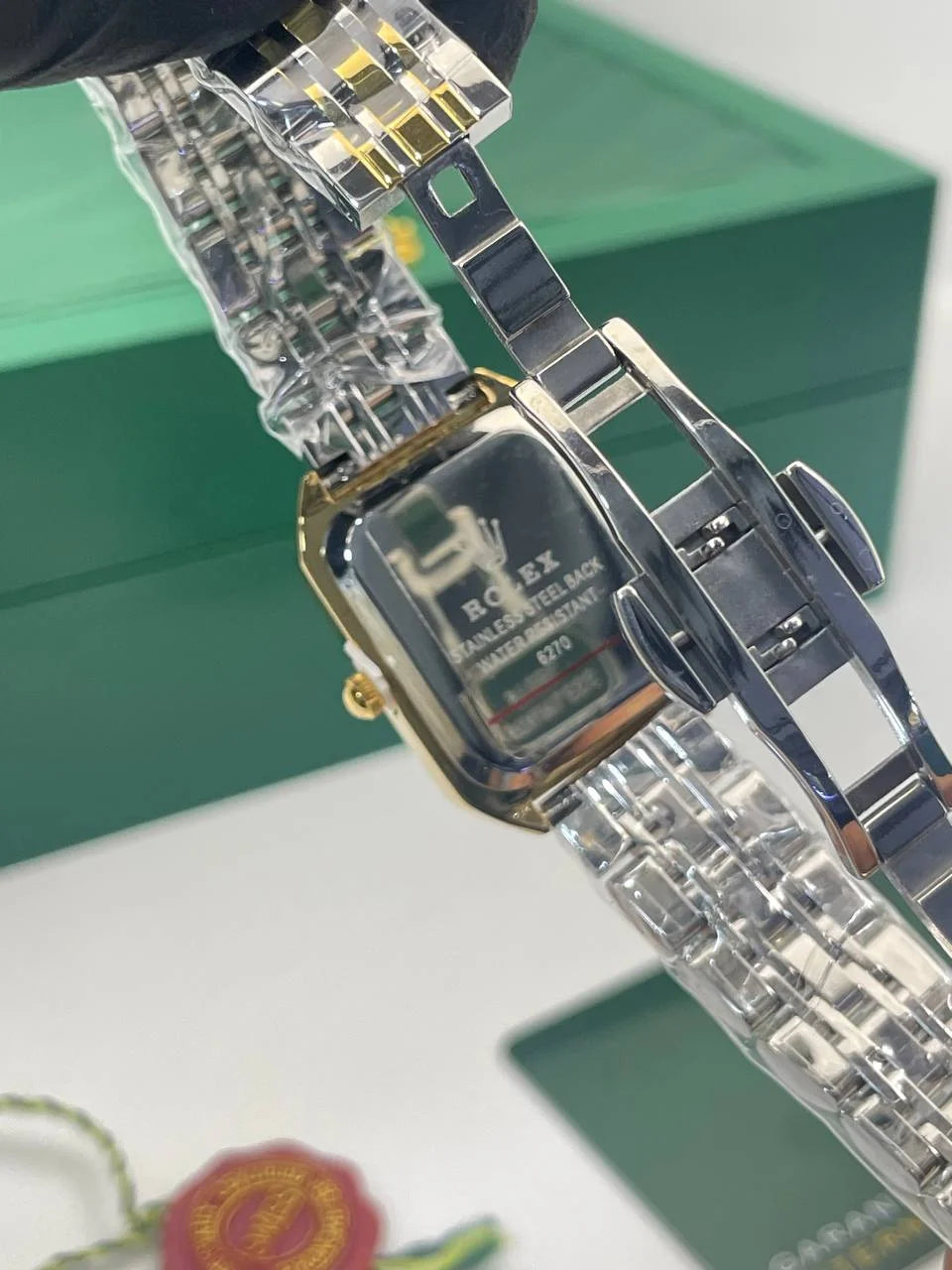 Bracelet en acier : Le bracelet en acier inoxydable, agrémenté de touches dorées, assure confort et durabilité. Sa finition brillante et son design élégant s'harmonisent parfaitement avec le boîtier.