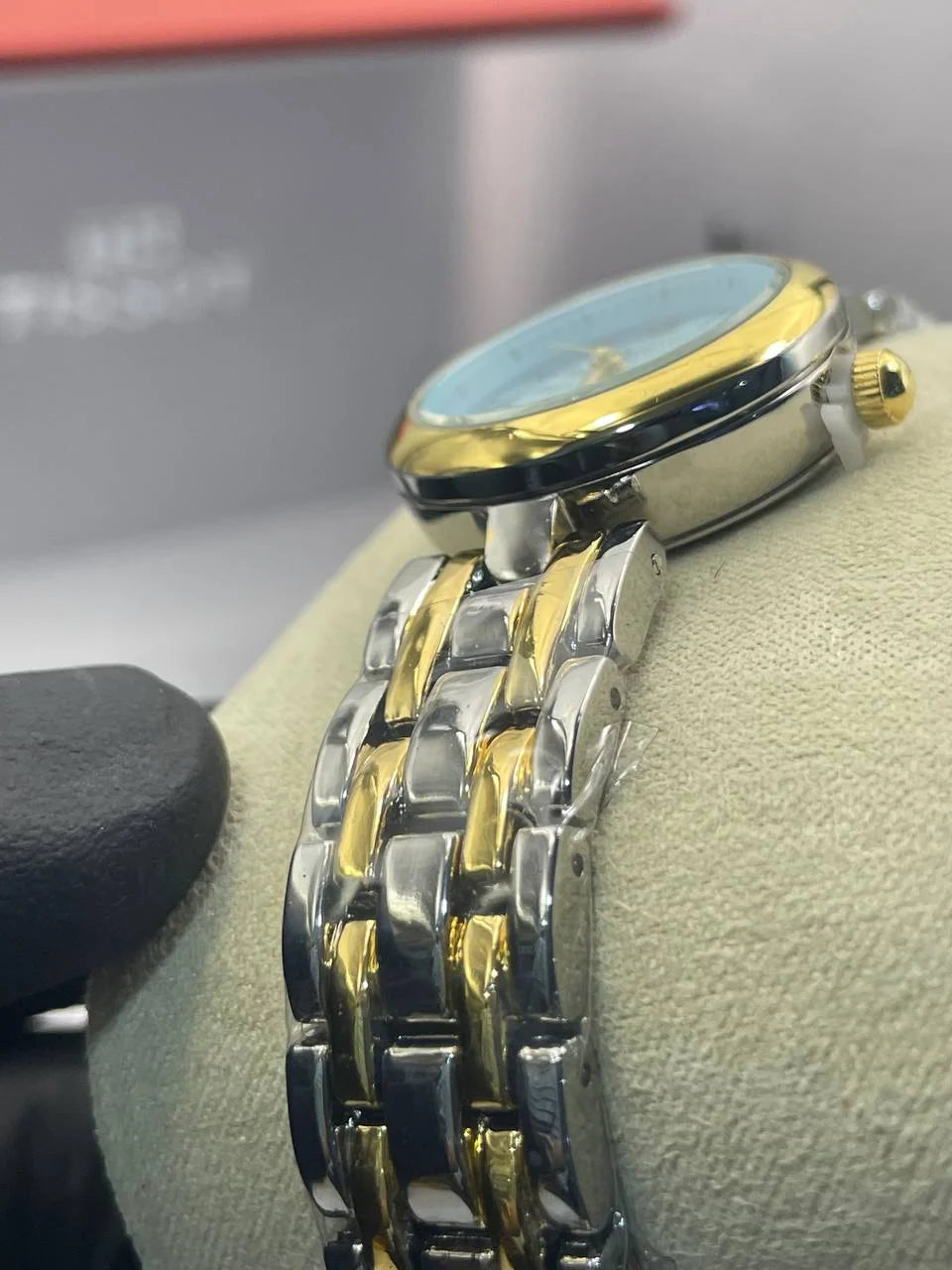 Cette montre Tissot se distingue par son boîtier en acier inoxydable avec des accents dorés, offrant une allure chic et moderne. Le bracelet en maillons, combinant acier argenté et doré, ajoute une touche de sophistication.
